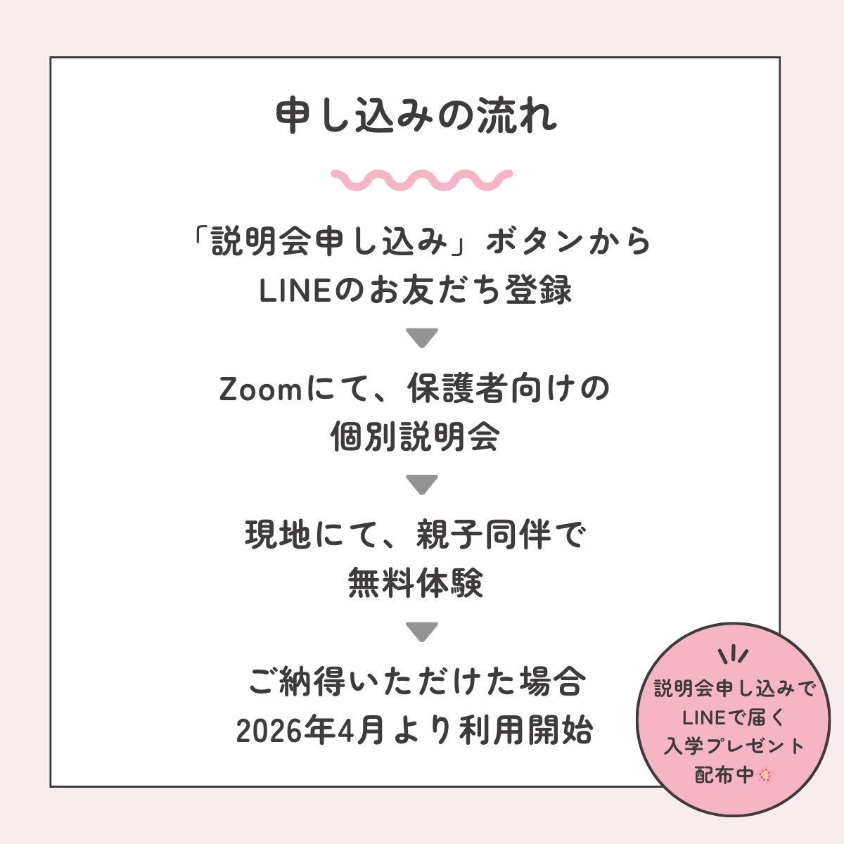 ※ 「説明会申し込み」をタップするとLINEが開きます。友だち追加後、小学校入学10大プレゼントと申し込みフォームが届きます!