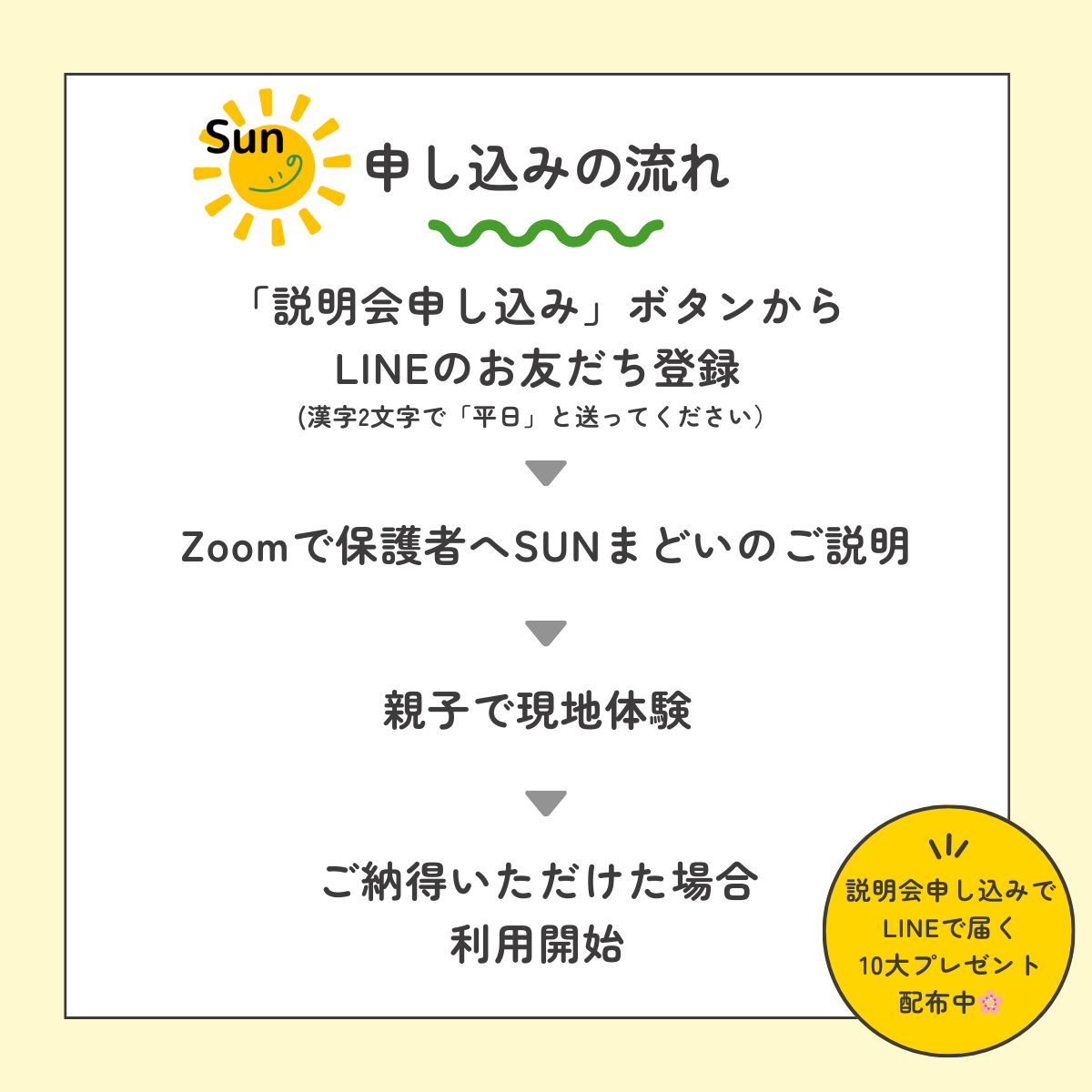 ※「説明会申し込み」をタップするとLINEが開きます。友だち追加後、「平日」と漢字2文字だけ送ってください!